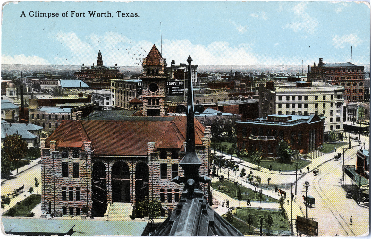 Description: Postcard: A Glimpse of Fort Worth, Texas. The postcard features a drawing of an aerial view of the city with buildings covering the picture and people and carriages visible on the street below.