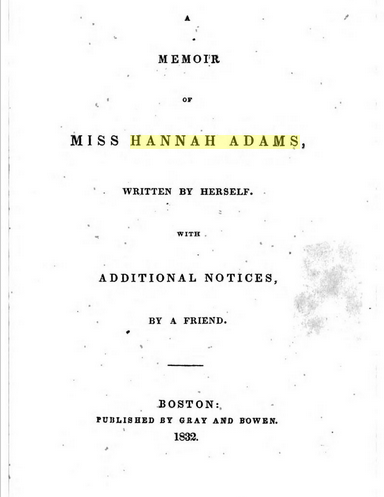 Credit: (1832) domain A Memoir of Miss Hannah Adams, Gray and Bowen