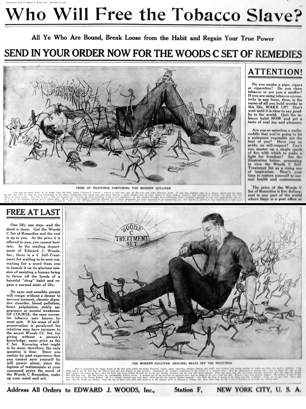 Description: FDA’s investigation of this tobacco treatment as a cure for tobacco addiction focused on its advertising. Edward J. Woods attracted the attention of potential buyers with this dramatic graphic, and a lengthy monologue starting with “Are you so spineless a molly coddle that you’re going to let a poisonous vegetable get the best of you?”
