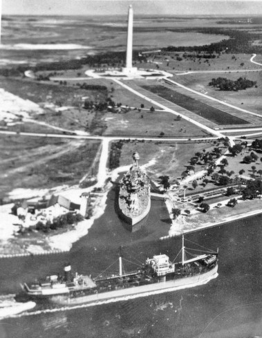 Description: An aerial view of the San Jacinto Monument and the Battleship Texas. Another ship can be seen on the body of water.