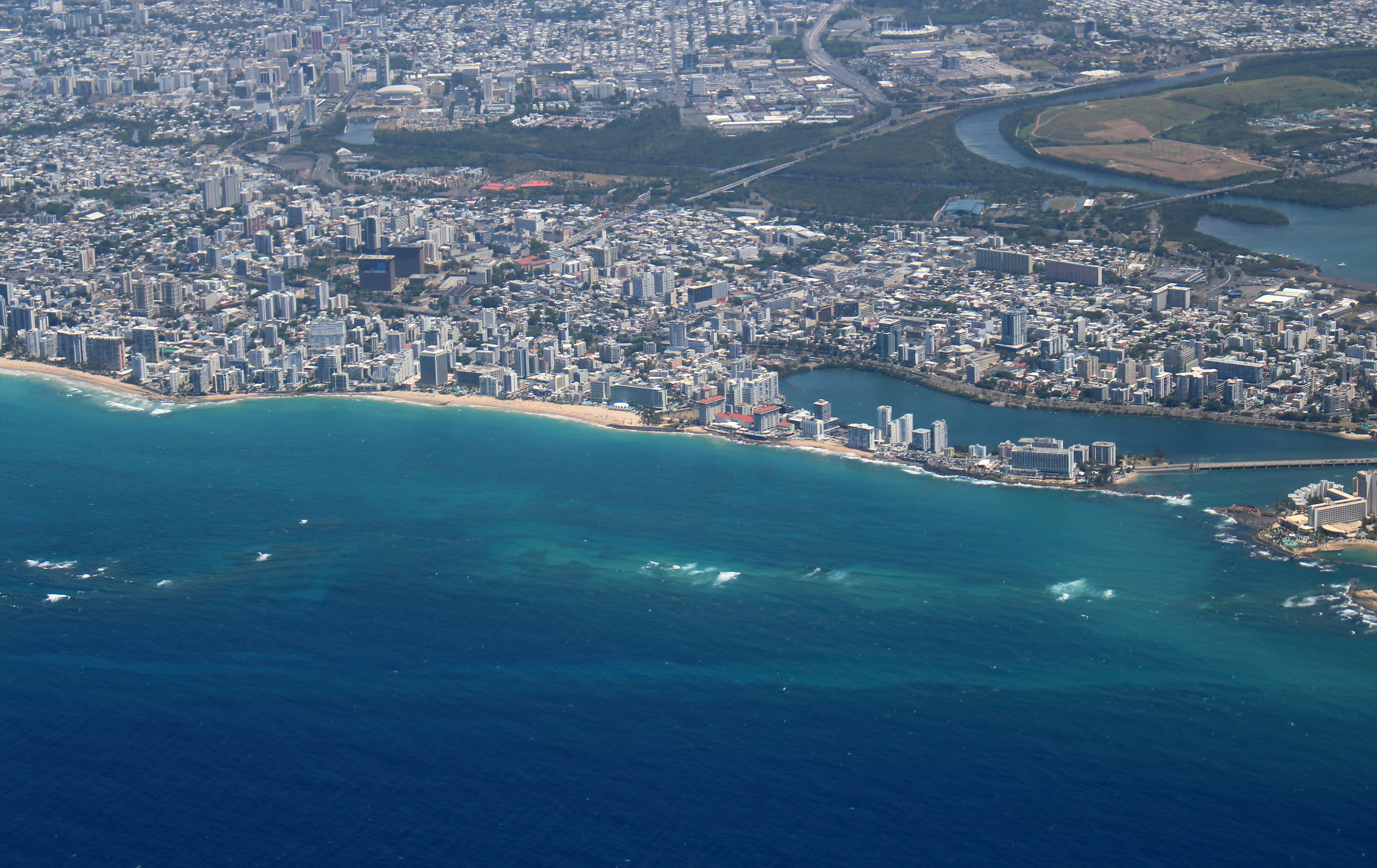 Description: The Condado neighborhood of San Juan, Puerto Rico as viewed by aircraft departing Luis Muñoz Marín International Airport. Photographed by user Coolcaesar on May 30, 2022.