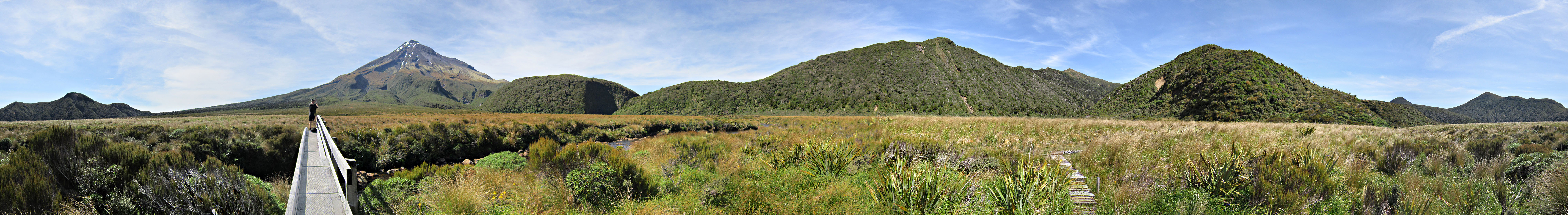 Description: A 360º panorama of the Ahukawakawa Swamp taken where the Pouakai Circuit boardwalk footbridge crosses the Stony River.