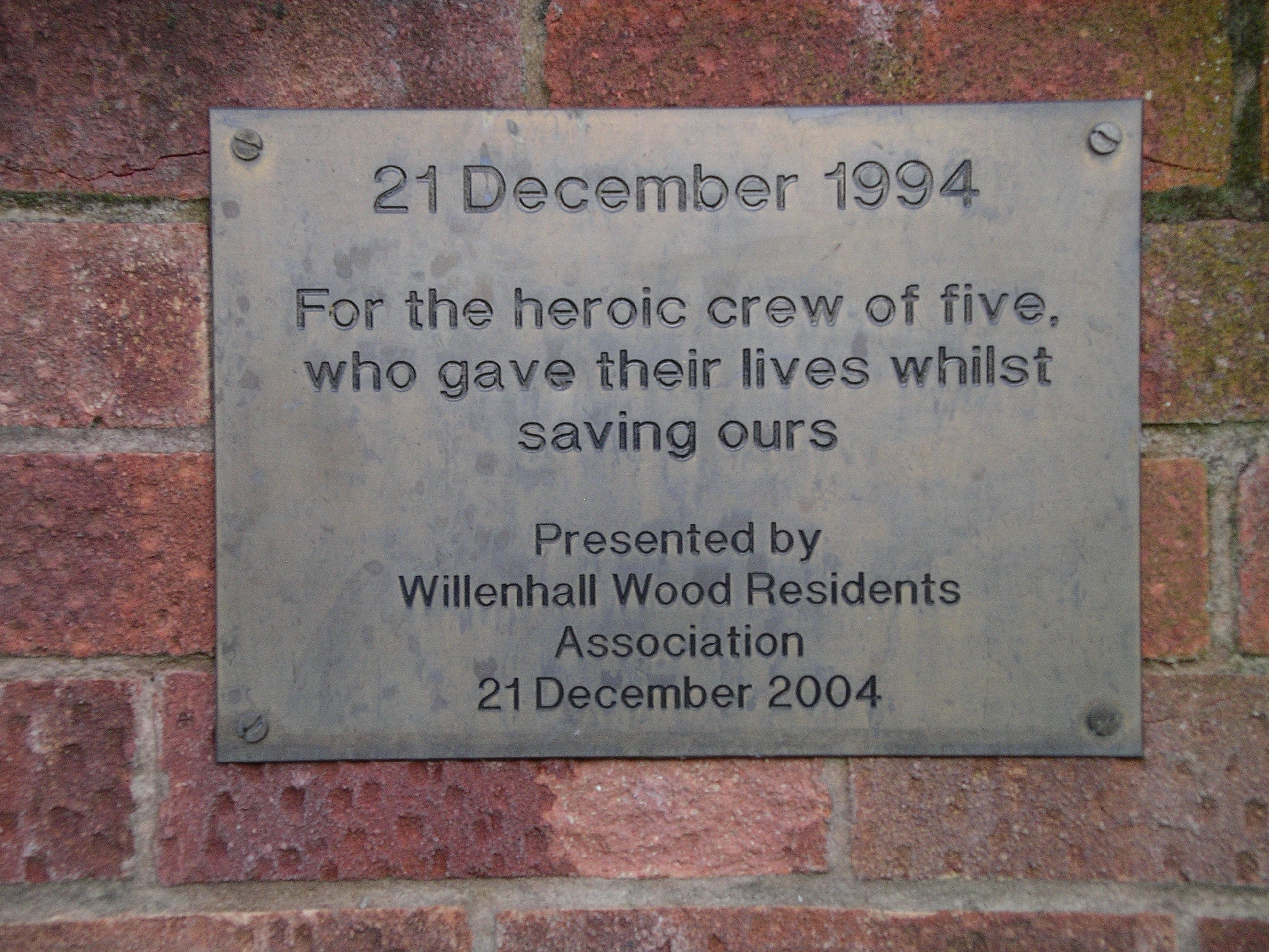 Description: Plaque on brick wall in Middle Rise, Willenhall, Coventry, England. It commemorates an aircraft crash that happened at that site on 21 December 1994. It was presented on the tenth anniversary of the crash.