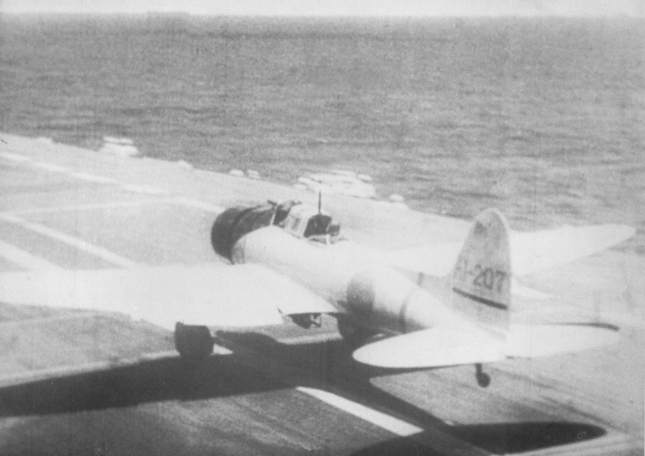 Description: An Aichi D3A Type 99 dive bomber takes off from the Imperial Japanese Navy aircraft carrier Akagi to attack British warships during the Indian Ocean Raid on 5 April 1942. The aircraft belongs to a section leader (shōtaichō), which is indicated by the single horizontal stripe underneath the tail code. The single vertical red stripe around the rear end of fuselage is Akagi identifier.
