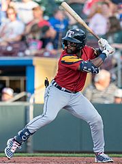 Description: Akil Baddoo batting for the Toledo Mud Hens on a rehab assignment during a 2022 game at Werner Park in Nebraska.