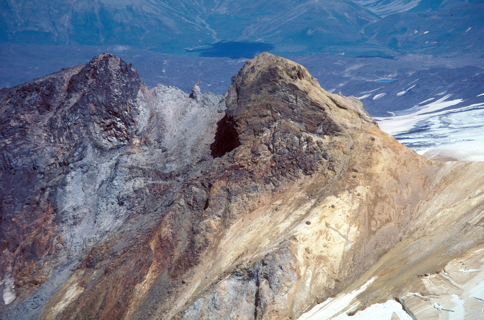 Description: Photo of the summit and crater of Alagogshak volcano in the Aleutian Range, Katmai National Park, Alaska, USA. Photo by E.W. Hildreth, Alaska Volcano Observatory. Color corrected and slightly cropped from slide image.