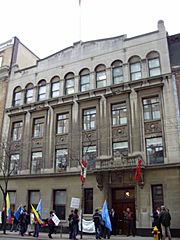 Description: The Albany Club in Toronto, Ontario. The protestors outside are demonstrating against free trade with Colombia.
