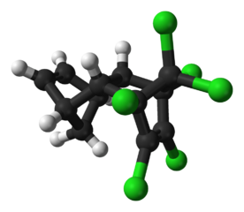 Description: Ball-and-stick model of the aldrin molecule, C12H8Cl6, as found in the solid state. X-ray crystallographic data from T. P. DeLacy and C. H. L. Kennard (1972). "Insecticides. Part III. Crystal structures of endrin (1,2,3,4,10,10-hexachloro-6,7-epoxy-1,4,4a,5,6,7,8,8a-octahydro-endo-1,4,-endo-5,8-dimethanonaphthalene) and aldrin (1,2,3,4,10,10-hexachloro-1,4,4a,5,8,8a-hexahydro-endo-1,4-exo-5,8-dimethanonaphthalene)". J. Chem. Soc., Perkin Trans. 2: 2153-2158. DOI:10.1039/P29720002153.. Model constructed in CrystalMaker 8.1. Image generated in Accelrys DS Visualizer.