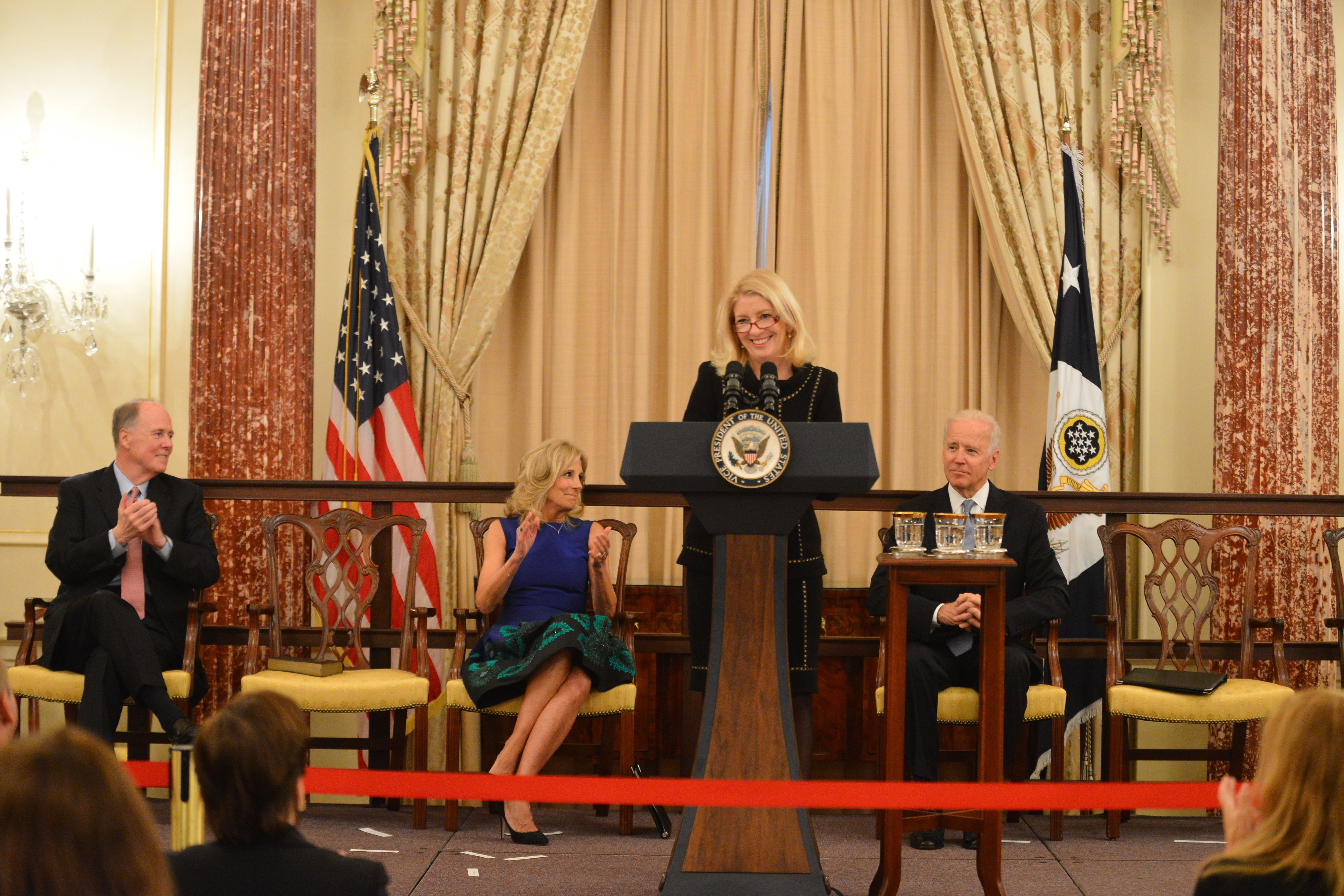 Description: With her husband Tom Donilon, Dr. Jill Biden, and Vice President Biden looking on, U.S. Ambassador-at-Large for Global Women’s Issues Catherine Russell delivers remarks at her swearing-in ceremony at the U.S. Department of State in Washington, D.C., on January 17, 2014. [State Department photo/ Public Domain]