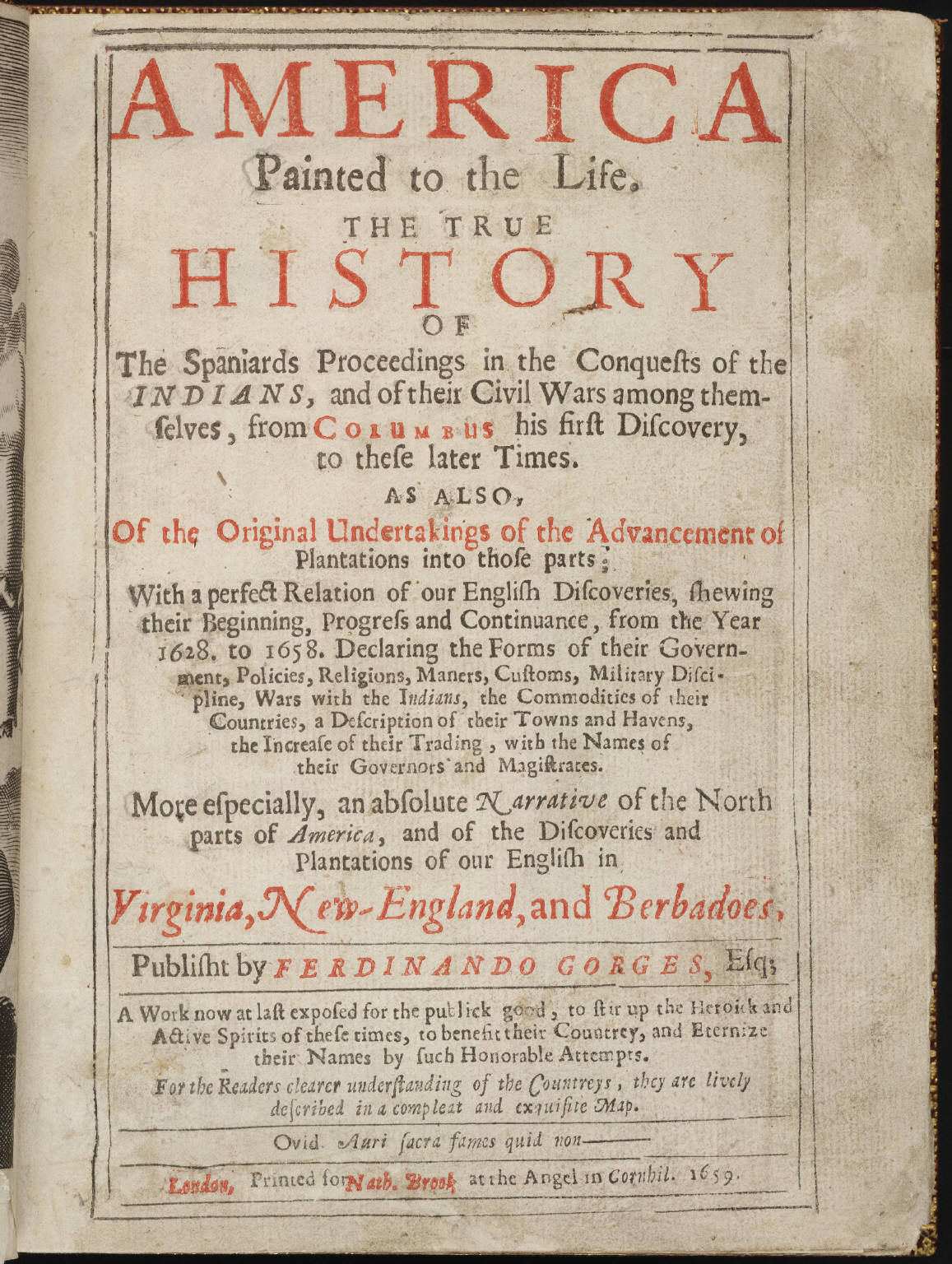 Description: "America Painted to the Life," published by Ferdinando Gorges, London, 1659. (Ferdinando Gorges, Esq., was the grandson of English colonial entrepreneur and founder of the state of Maine.) Title page. Courtesy of the Beinecke Rare Book & Manuscript Library, Yale University.[1]