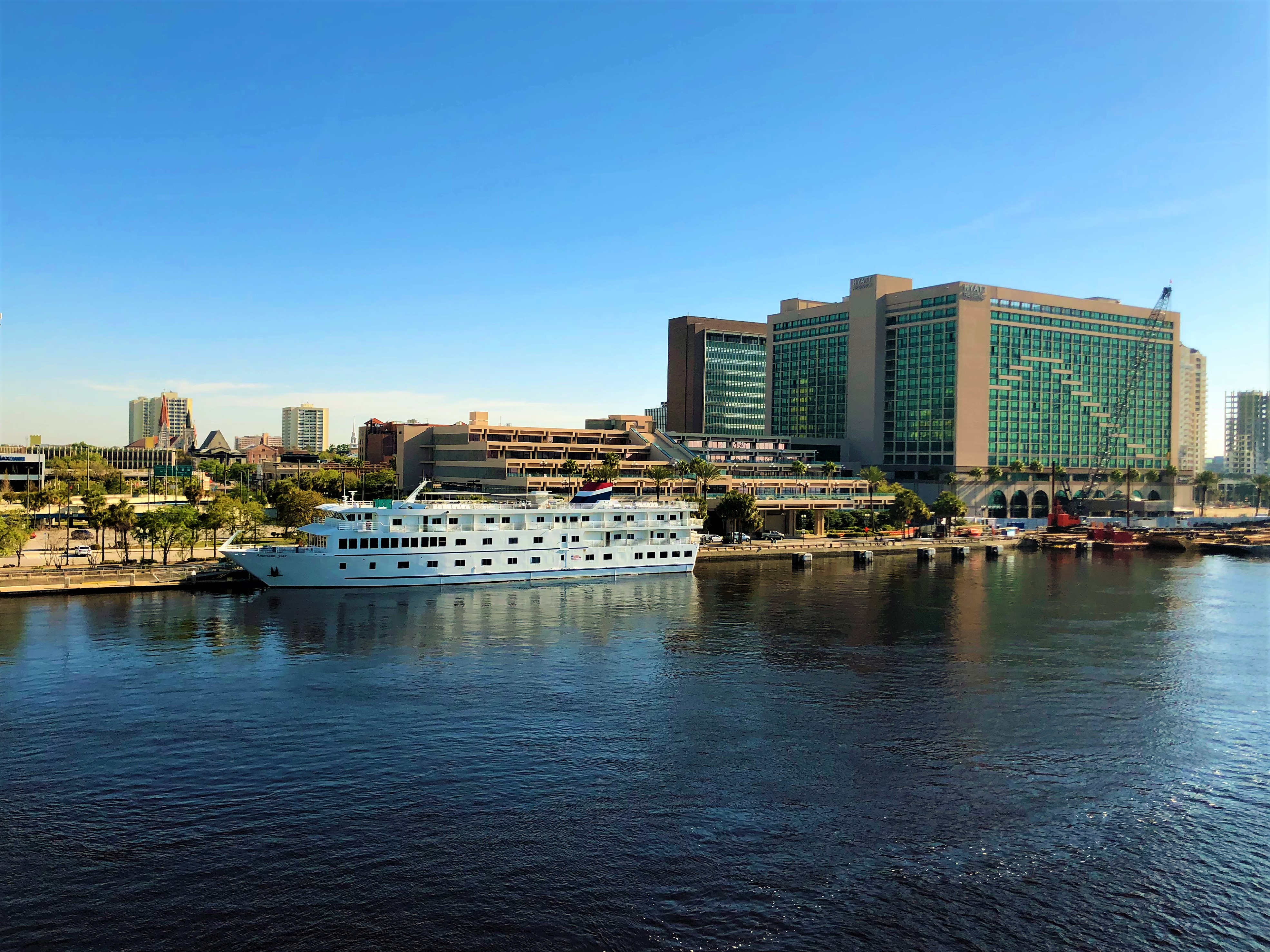 Description: An American Cruise Line ship docked in Jacksonville, Florida.