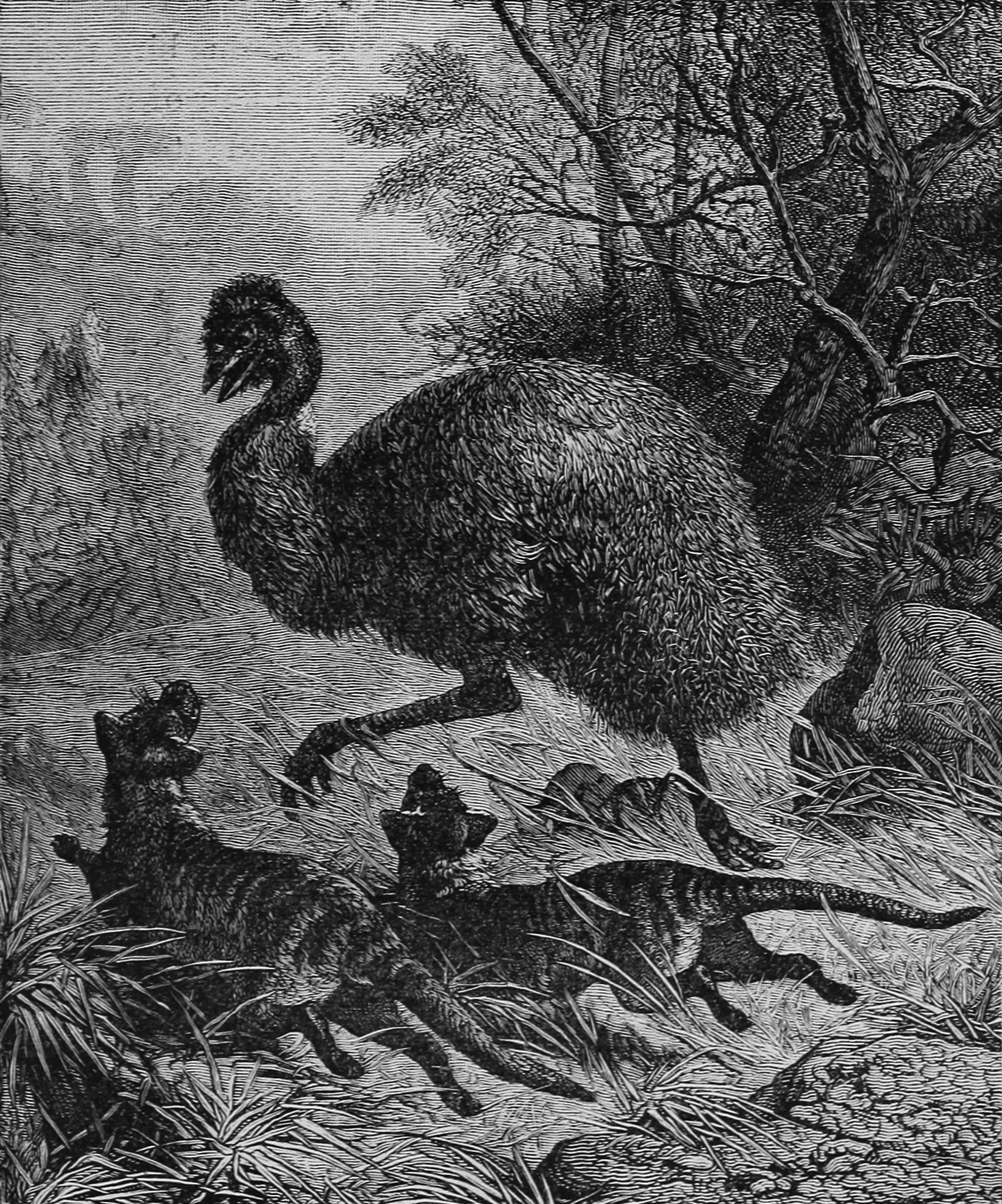 Description: Identifier: animallifeinseao00coop (find matches) Title: Animal life in the sea and on the land Year: 1887 (1880s) Authors: Cooper, Sarah. (from old catalog) Subjects: Zoology Publisher: New York, Harper & brothers Contributing Library: The Library of Congress Digitizing Sponsor: The Library of Congress View Book Page: Book Viewer About This Book: Catalog Entry View All Images: All Images From Book Click here to view book online to see this illustration in context in a browseable online version of this book. Text Appearing Before Image: ew years. 9. An ostrich farm is merely a large grassy enclosurein which are placed a few ostriches. It is customary tohatch the eggs by means of an incubator, it havingbeen found that the important point in hatching eggs isto keep them constantly at the same temperature as thebody of the bird when she is sitting. For this purpose alarge chest is used with sliding drawers, between whichare vats filled with hot water. The eggs are snuglywrapped in flannel and placed in the drawers, where theyremain six weeks before hatching, and great care is takento imitate the natural method as closely as possible. 10. The Rhea.—A smaller ostrich than the one we have RUNNING-BIRDS. 281 been speaking of, called the rhea, is found in South Amer-ica. It lives in flocks on the pampas, and is about one halfthe size of the African ostrich. 11. The Emu.—Another singular bird is the emu, whichis found only in Australia. It is nearly as large as theostrich, but it is not perched upon such long legs, and it Text Appearing After Image: Fie:. 187.—Emu and Wolves. 282 ANIMAL LIFE IN THE SEA AND ON THE LAND. has three toes on each foot. This is the only one of therunning-birds that wanders about in pairs, and its largeeggs are of a beautiful dark green color. 12. The Cassowary.—Running-birds are not numerous,and, as you may have noticed, each species that we havementioned so far is confined to a limited extent of coun-try. This is also true of the cassowary, which inhabitsNew Guinea and the Molucca Islands. The black plu-mage of this bird resem-bles the hair of a horsesmane, and its head isvery conspicuous, witha horny crest on top,while the naked throatis ornamented with redand blue wattles hang-ing in front. Its wingsare extremely small, andthey are armed with fivenaked quills. 13. The Apteryx.—Most curious of all therunning-birds is the ap-teryx, which is foundnowhere but in NewZealand. It has no tail, and the stumpy wings are quitehidden by its plumage. It digs a deep hole in the groundin which to deposit its Note About Images Please note that these images are extracted from scanned page images that may have been digitally enhanced for readability - coloration and appearance of these illustrations may not perfectly resemble the original work.