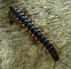 Description: Asiomorpha coarctata, an Asian millipede commonly mistaken for the N. American Harpaphe haydeniana because of the similarity in coloration. A good way to tell them apart is to look at the paranota - the lateral edges of each segment. In Asiomorpha, the paranota are sharp edged and acute, pointing backward. This specimen is from the Philippines.