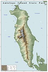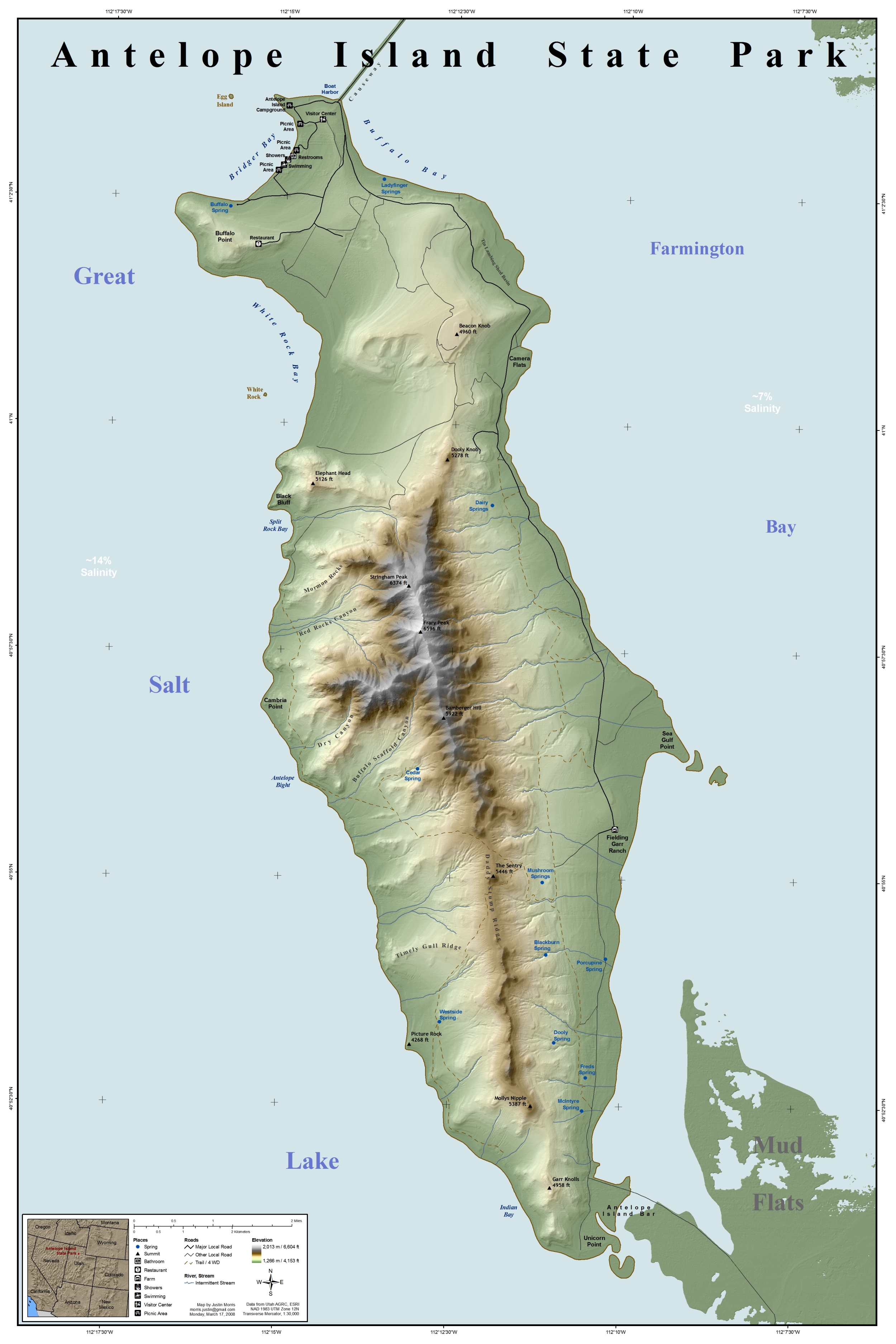 Description: Map of Antelope Island State Park, Utah, Southwestern United States. Showing predominant features of Antelope Island.