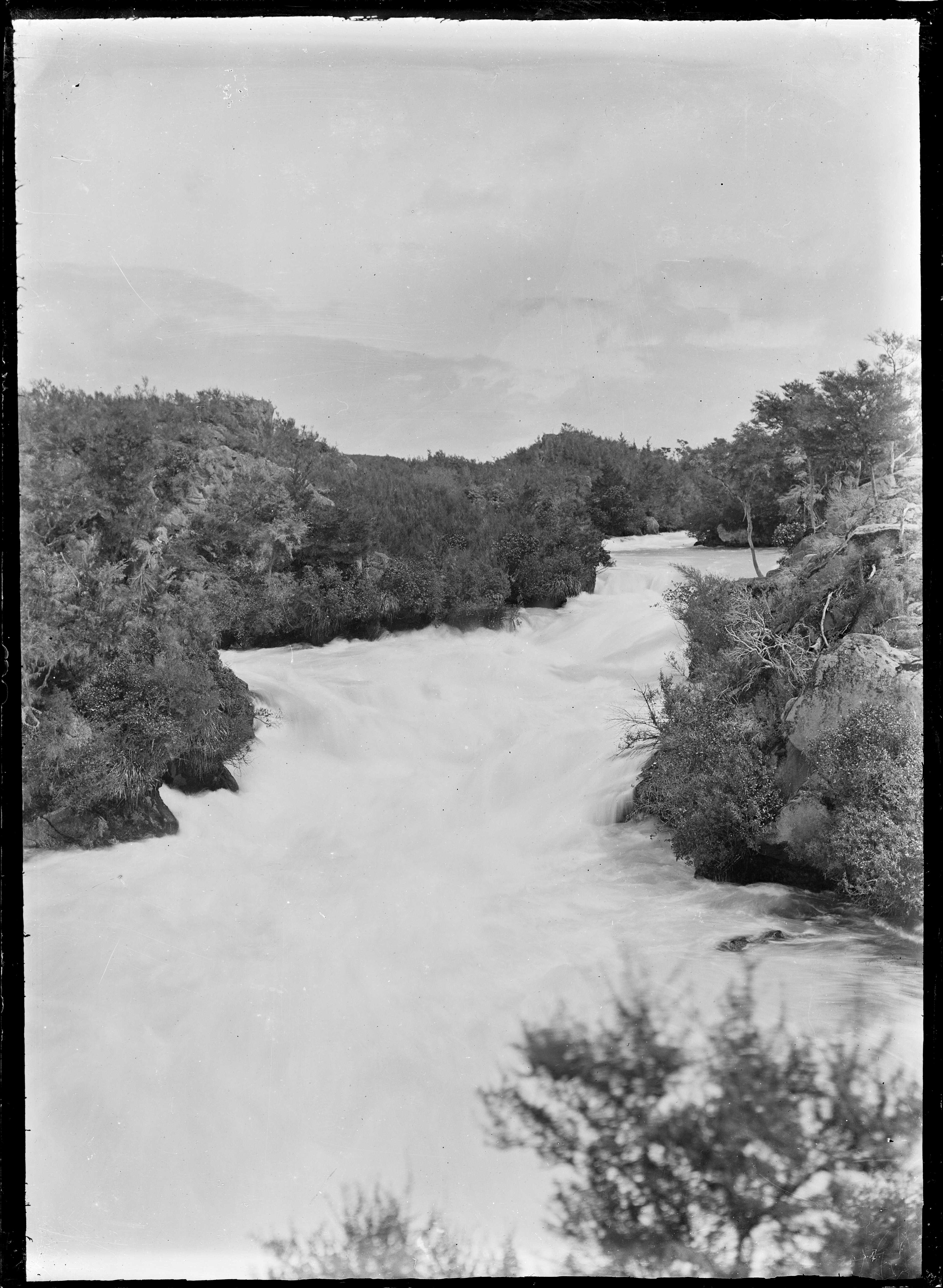 Description: View looking up the Aratiatia Rapids on the Waikato River. Photographed by Albert Percy Godber in 1928.