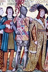 Description: Archibald 'Bell-the-Cat' depicted on a frieze showing notable figures in Scottish history. Arms of Archibald Douglas, 5th Earl of Angus (d.1593) up until 1491; Quarterly of 4 surtout: Argent, a man’s heart gules imperially crowned proper and on a chief azure three mullets argent (Douglas), 1st: Gules, a lion rampant argent (Earldom of Angus); 2nd: Or, a lion rampant gules debruised by a riband sable (Lordship of Abernethy); 3rd: Ermine, three chevrons gules (Lordship of Liddesdale); 4th: Or, a fess chequy azure and argent surmounted by a bend gules charged with three buckles or (Stewart of Bonkyll).