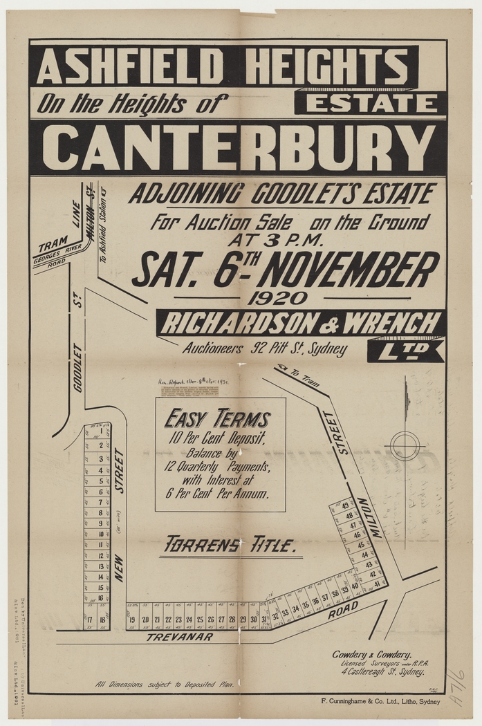 Description: Ashfield Heights Estate Canterbury, 1920, Richardson and Wrench, New St, Trevenar Rd, Milton St, Goodlet St, lithograph F Cunningham and Co., State Library of New South Wales Z/SP/A7/6