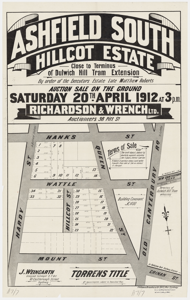 Description: Ashfield South Hillcot Estate, 1912, Richardson and Wrench, Hanks St, Wattles St, Mount St, Hardy St, Old Canterbury Rd, lithograph William Brooks and Co., State Library of New South Wales Z/SP/A7/7