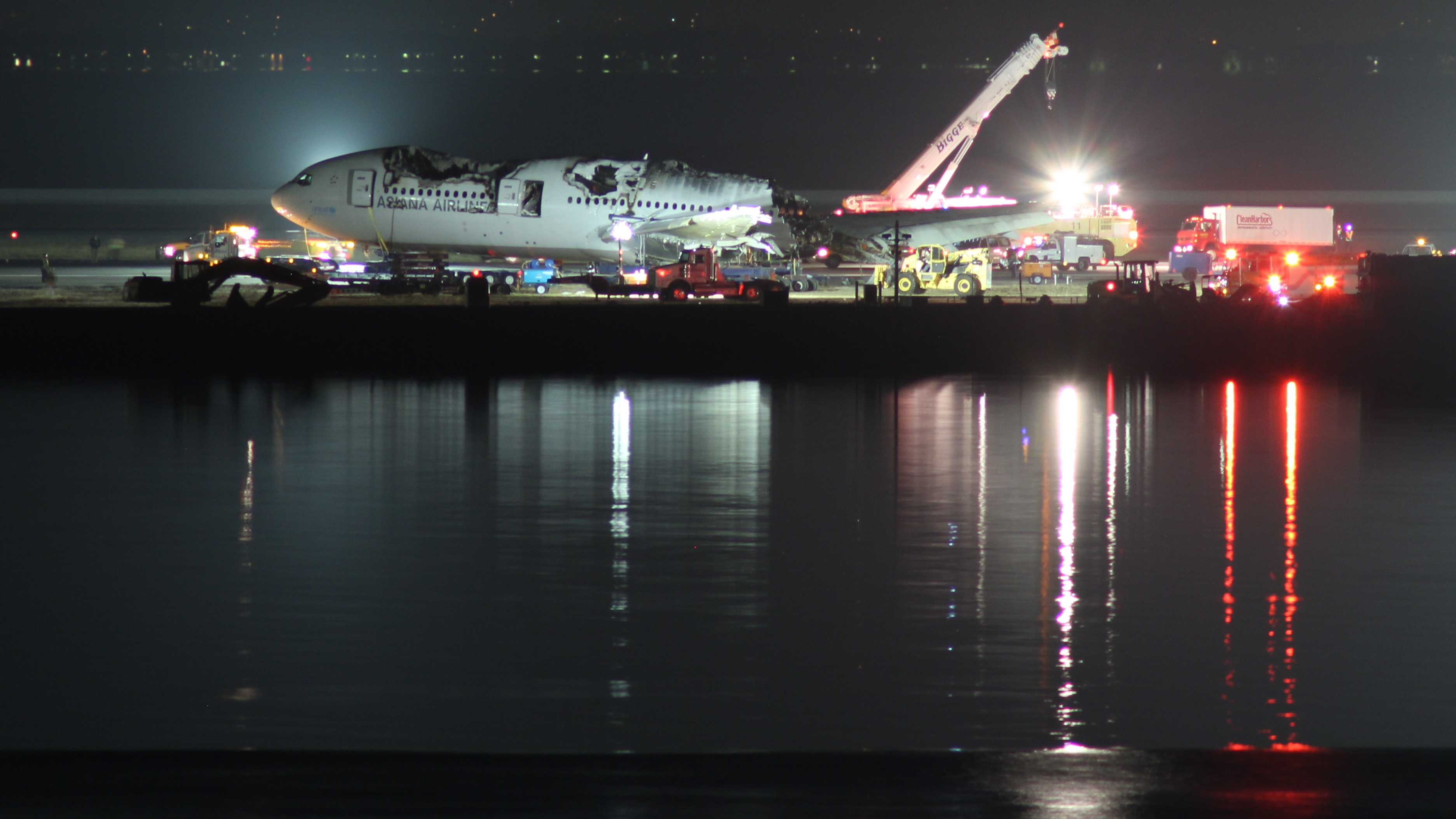 Description: Crews work through the night to remove the fuselage of a destroyed Boeing 777-200ER from a field adjacent to Runway 28L at San Francisco International Airport (SFO). Asiana Airlines flight 214 crash landed at SFO on 6 July 2013.