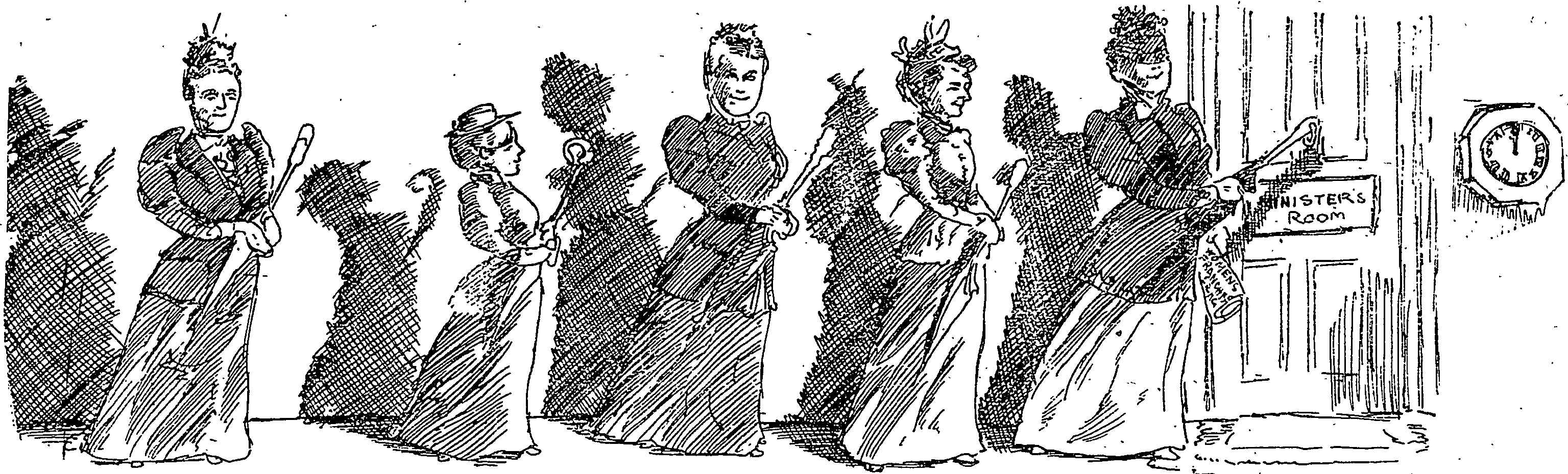 Description: Illustration in the New Zealand newspaper 'The Observer' Volume XI, Issue 756, 24 June 1893. Captioned "The Auckland Female Franchise League comes smilingly up to the scratch to interview the. Premier on the subject of the rights of women. The League is chirpy."