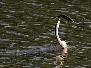 Description: An Australian Darter (Anhinga novaehollandiae) after a successful fishing expedtion in Cooks River, New South Wales, Australia.