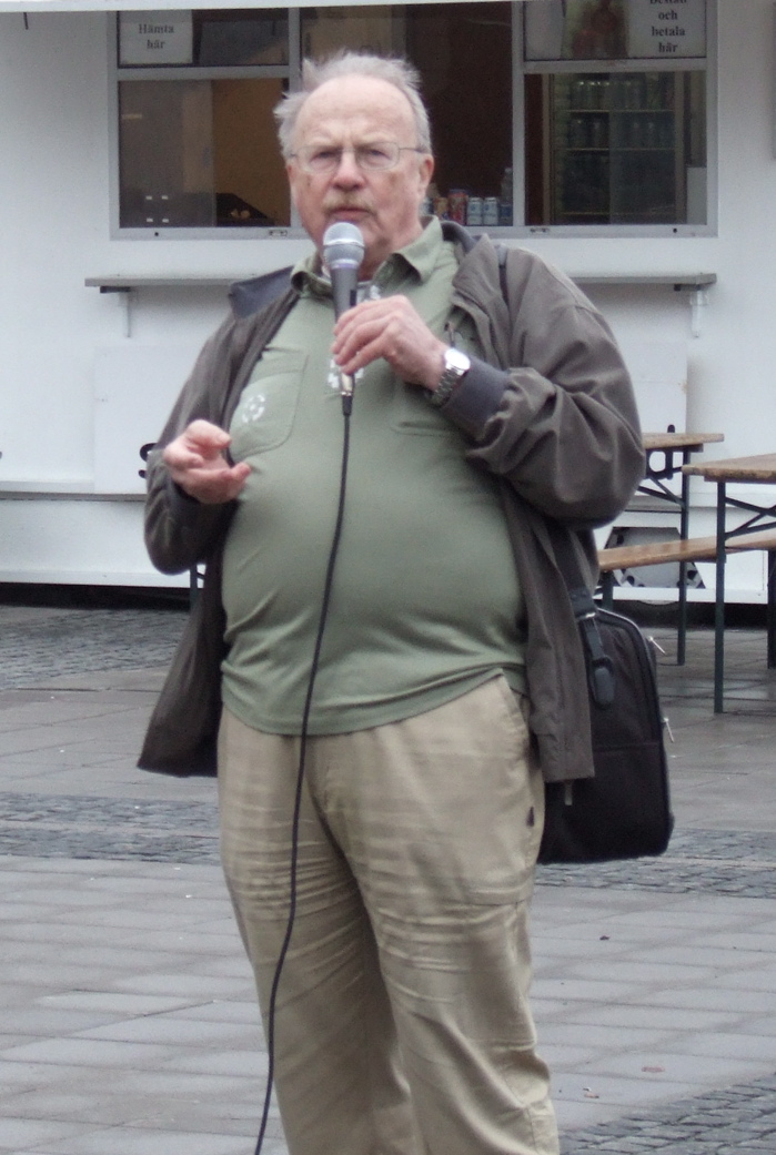 Description: The swedish author Jan Myrdal on a public political meeting against Swedish engagement in the war in Afghanistan. The meeting was on Södermalmstorg in Stockholm, Sweden.