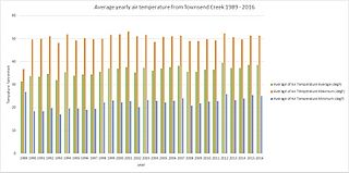 Description: The average yearly air temperature recorded from the Townsend Creek Snotel Site form 1989 to 2016.