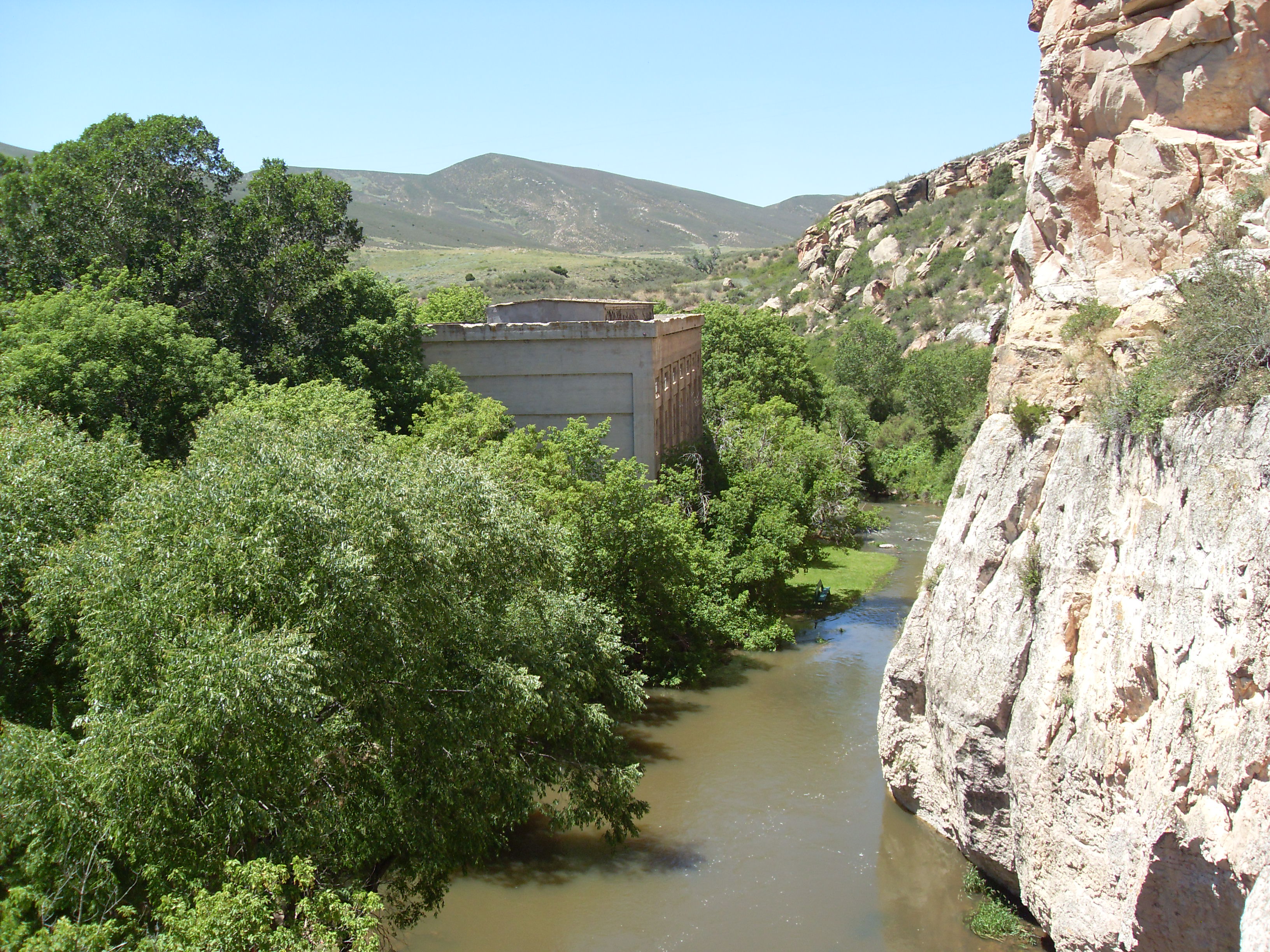 Description: View from the Ayres Natural Bridge down to the LaPrele Creek and the old power house at the entrance of Ayres Natural Bridge Park in Converse County, Wyoming