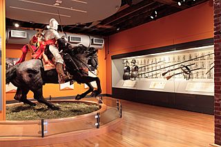 Description: Antique armor, pole arms, and rifles before a combat tableau in "British Royal Armouries USA."