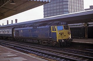 Description: British Rail Class 50, 50010, in BR all-over blue livery at Reading General on an up train in 1974. Number history: D410, 50010 Name: Monarch Scanned from a Kodachrome 35mm slide.