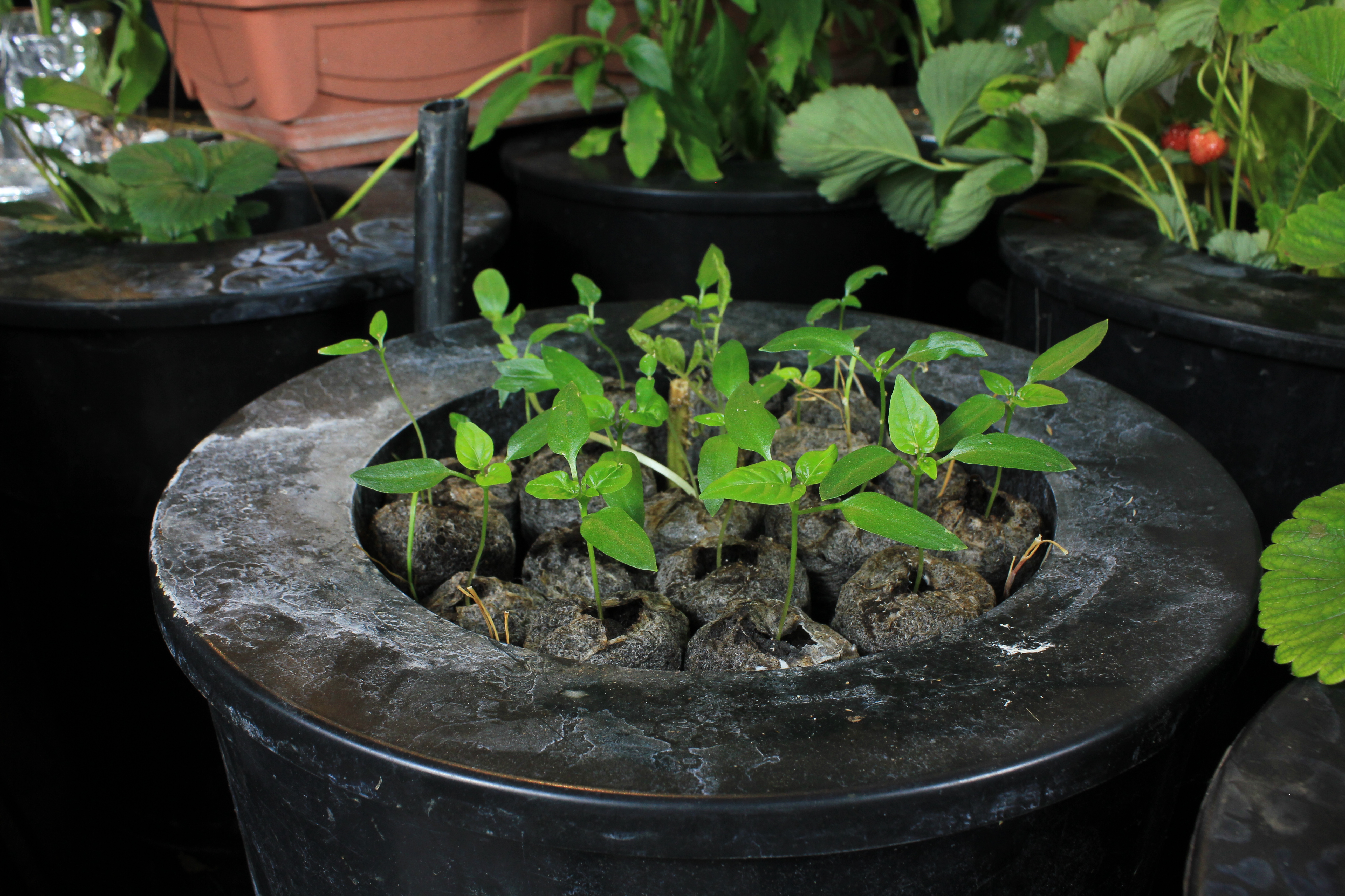 Description: there are almost 20 small pepper plants in one large net basket this is the most i have attempted in one pot so far my record is 5 plants in one pot.
