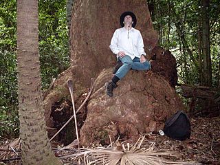 Description: this large tree was identified by A.G. Floyd as Eucalyptus botryoides. Hacking River, NSW, Australia. Person photographed is Peter Woodard. Plant to the left is the Cabbage Tree Palm, (Livistona australis)