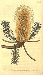 Description: This digital image is a reproduction of an illustration of a species identified as Banksia ericifolia.