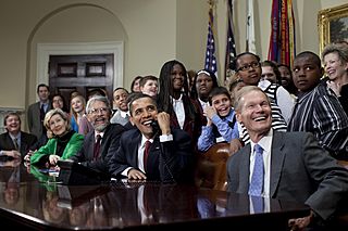 Description: President Barack Obama is joined by members of Congress, including former astronaut Sen. Bill Nelson, right, and school children as he talks Tuesday, March 24, 2009, with astronauts on the International Space Station from the Roosevelt Room at the White House.