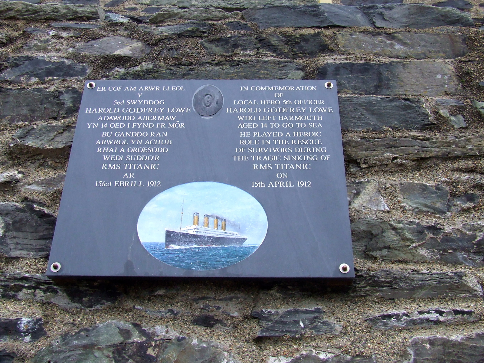 Description: Plaque for Barmouth 'local hero' Harold Godfrey Lowe, 5th Officer on the RMS Titanic