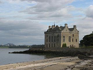 Description: Barnbougle Castle, on the Dalmeny Estate near Edinburgh, Scotland. View from the north-west with Edinburgh in the background.