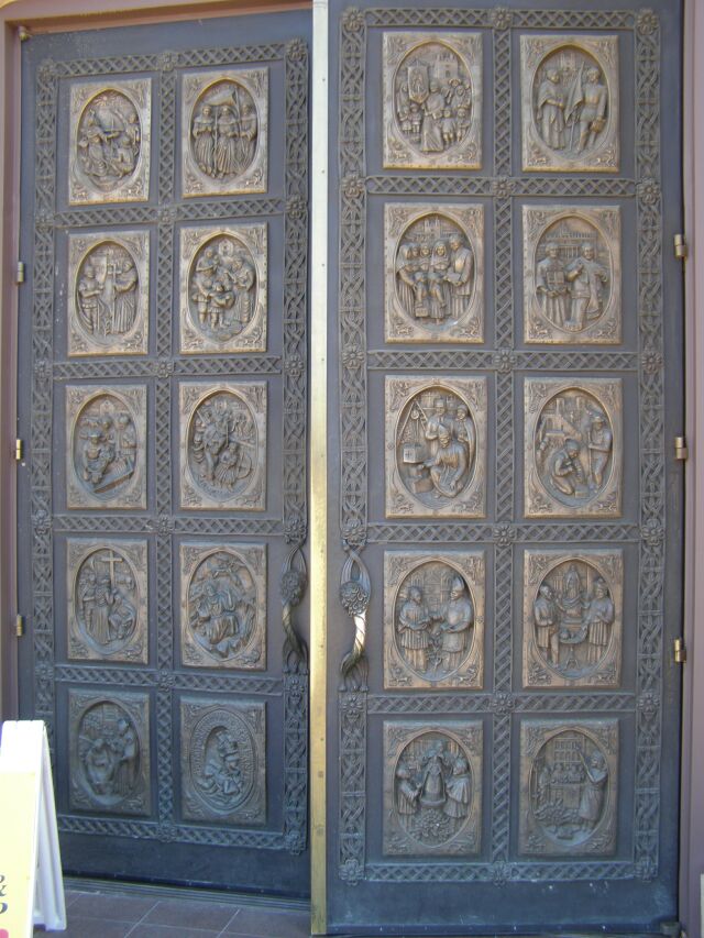 Description: Main bronze doors of the Cathedral Basilica in Santa Fe, New Mexico