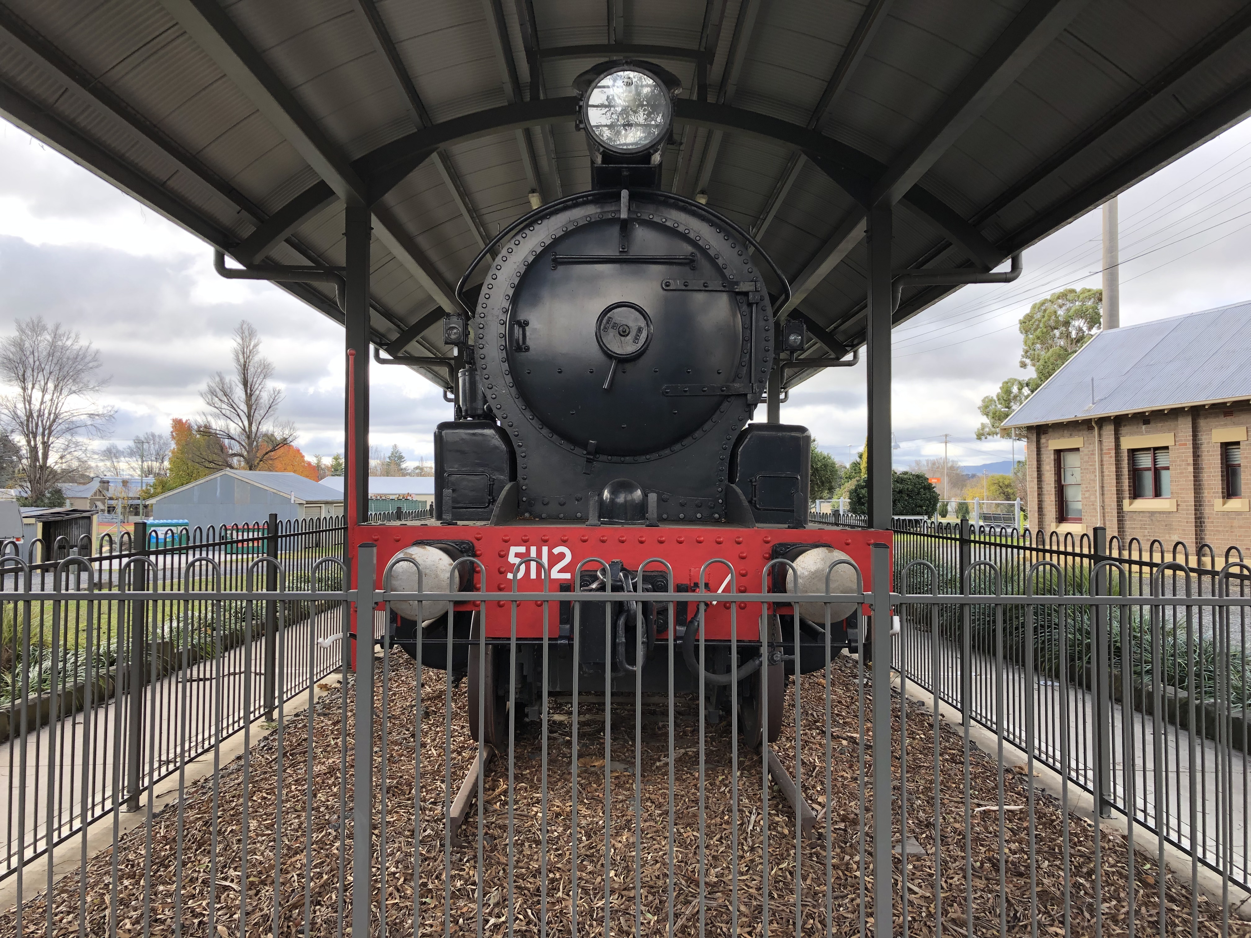 Description: A front-view of the 5112 locomotive on display at the front of the Bathurst railway station, NSW. It is also known as the "Chifley Engine" as Prime Minster of Australia Ben Chifley regularly drove the engine before he entered politics.