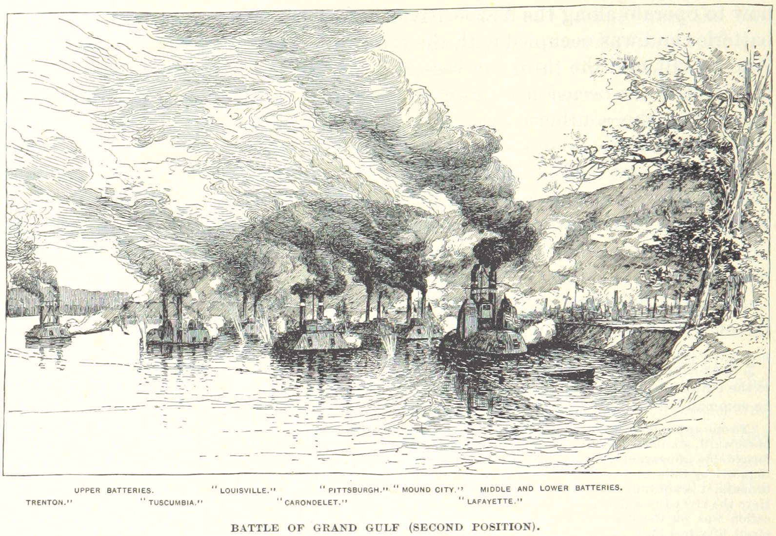 Description: Union gunboats bombard Confederate positions during the Battle of Grand Gulf.