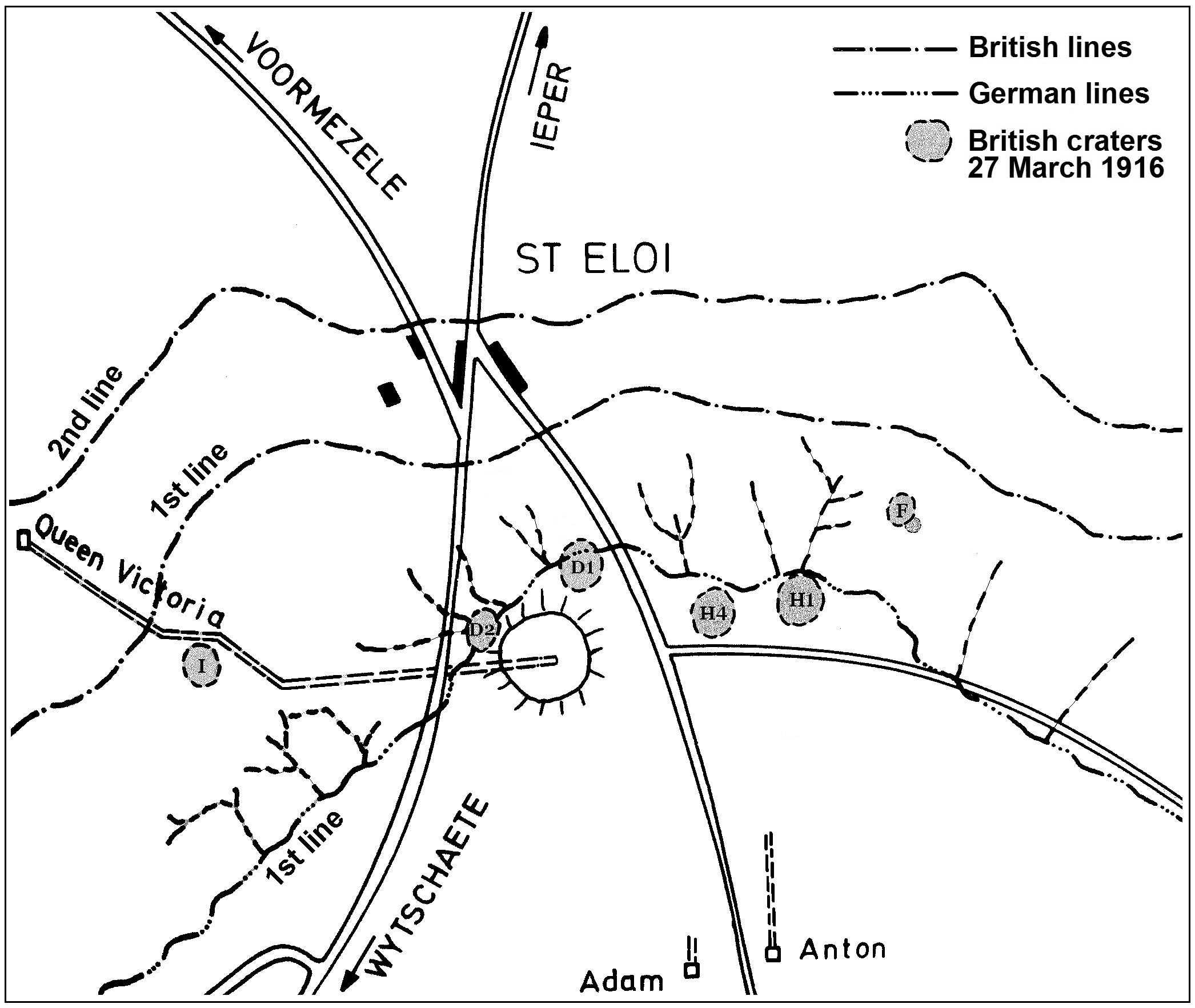 Description: Map of St Eloi with evidence of British mining: craters of the six mines fired on 27 March 1916 at the start of the Battle of St Eloi Craters and plan of the deep mine dug from the "Queen Victoria" gallery and fired on 7 June 1917 as part of the mines placed by the tunnelling companies of the Royal Engineers in the Battle of Messines. This drawing is based on the plans published in Roger Lampaert, De Mijnenoorlog in Vlaanderen 1914–1918, Roesbrugge/Belgium (Drukkerij Schoonaert) 1989; and Simon Jones, Underground Warfare 1914-1918, Barnsley (Pen & Sword Books) 2010, p. 100