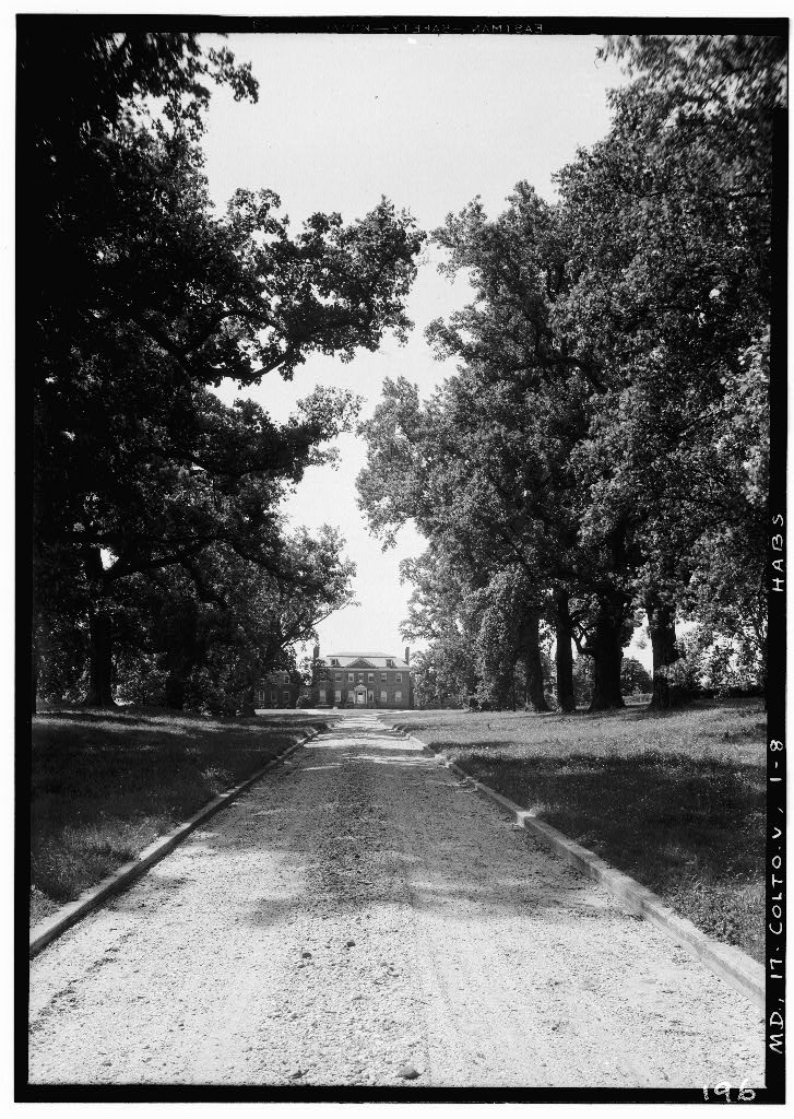 Description: View of the Gardens and Distant BELAIR MANSION Plantation. View from the front (North) ALONG ENTRANCE DRIVE (1936). Located in Collington; on the National Register of Historic Places. Image courtesy of the federal HABS—Historic American Buildings Survey of Maryland. View Along ENTRANCE DRIVE of Gardens and distant BELAIR MANSION From North (Front); Collington; HABS MD,17-COLTO.V,1-8