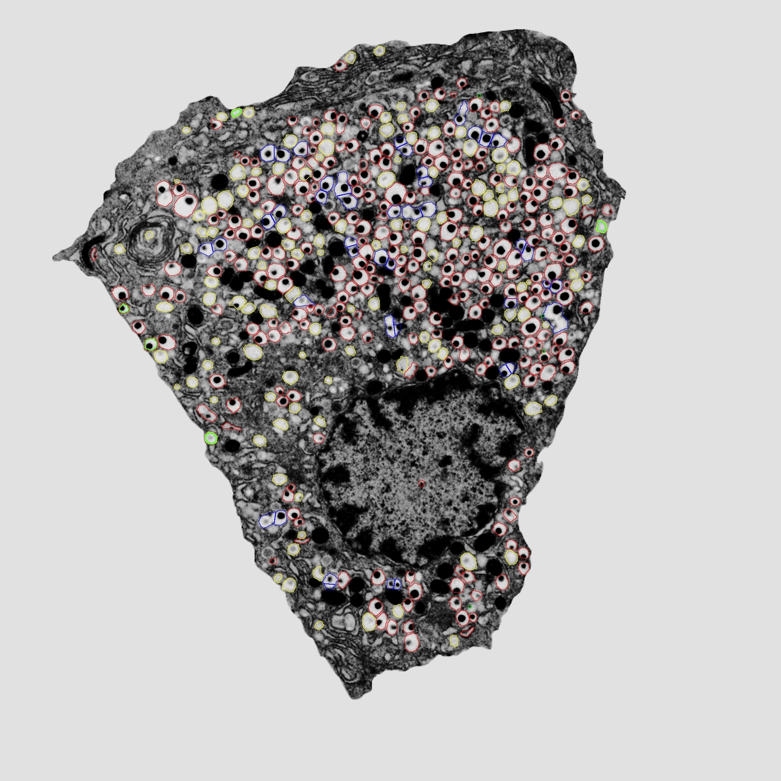 Description: Photomicrograph of a sliced rat beta cell that has been processed with the modified NASA imaging technology. Insulin granules are the dark black spots surrounded by a white area called a halo. Large cells have hundreds of insulin granules. The colored borders around the granules are labels added to identify them and classify how they appear.