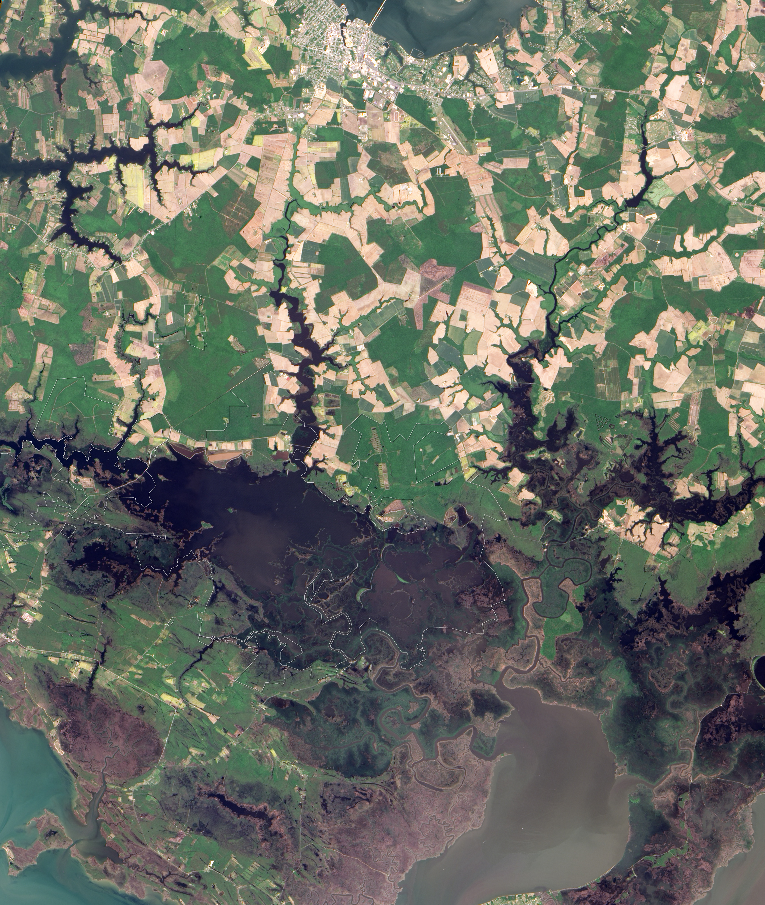 Description: Much of the water in this preserve appears dark purple-brown, especially in the west and north. In the south-east, the water appears paler in colour, likely due to a combination of exposed and submerged land. Sunglint—the mirror-like reflection of sunlight off the water’s surface—may also lighten the water’s appearance. Drier land, including farmland, varies in colour from green to beige. A patchwork of fields occurs near the Little Blackwater River. A white outline delineates the complicated park boundary, which negotiates a maze of private lands outside the park.