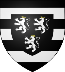 Description: blason de la commune de queant, pas de calais, france :de sable aux trois dasces d’argent sur le tout de sable aux trois lionceaux d’argent, lampassés et couronnées d’or.