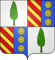 Description: blason de la commune de Thueyts, ardèche, france : Écartelé : au premier et au quatrième d'argent au cyprès de sinople, au deuxième et au troisième parti au I de gueules aux trois bandes d'or et au II d'azur aux trois roses d'or rangées en pal.