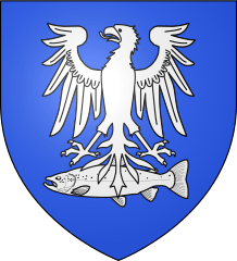 Description: blason de la commune de Aiglun : D’azur à l’aigle d’argent empiétant un poisson du même.