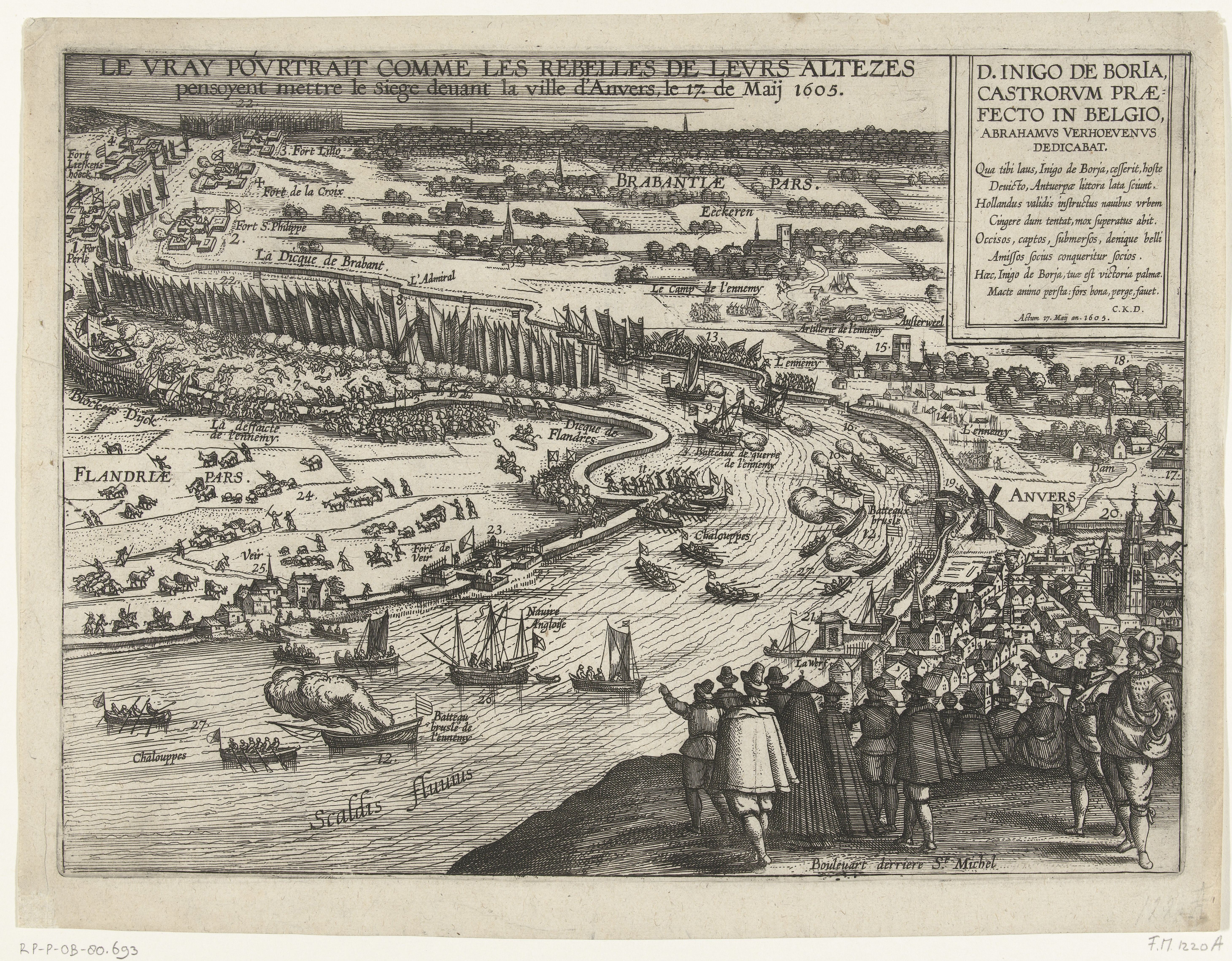 Description: Inigo de Borja repulses a Dutch force attempting a landing near Antwerp, 17 May 1605, published by Abraham Verhoeven
