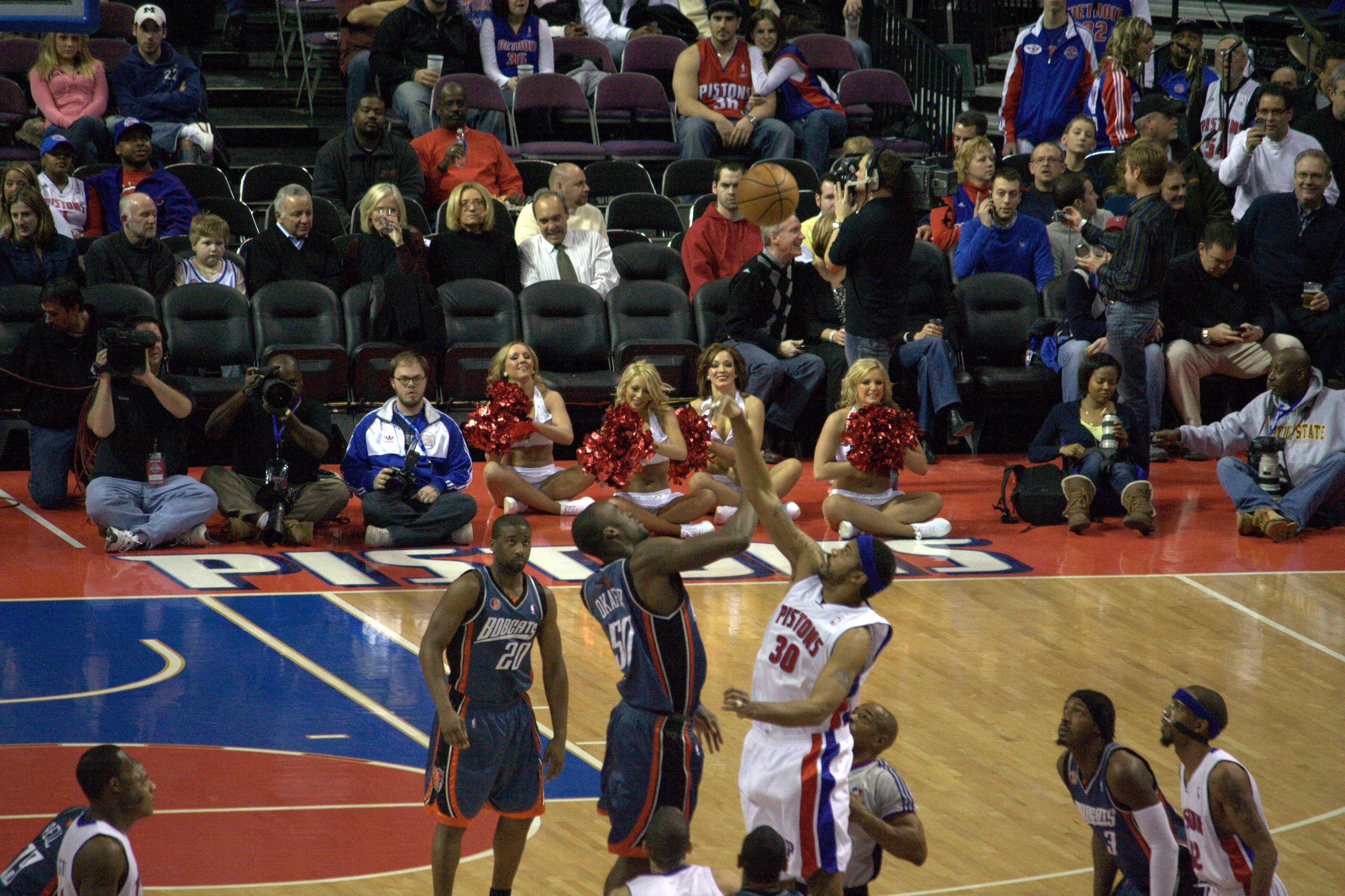 Description: Tip-off between Emeka Okafor of the Charlotte Bobcats and Rasheed Wallace of the Detroit Pistons. Raymond Felton (20), Gerald Wallace and Richard "Rip" Hamilton look on.