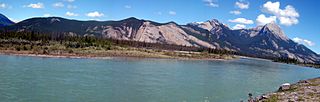Description: Boshe Range in the Canadian Rockies, Jasper National Park, seen from the Icefield Parkway, Athabasca River in foreground