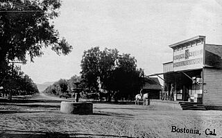 Description: A postcard photograph of the Bostonia Store, probably in the early 20th century. The store was founded in 1886. A rider on his horse and two men are seen in front of the store. There is a fountain in the center of the road. The store's location was 2nd at Broadway, and remained there until it closed in February 1960 to make way for a gas station. The postcard has a divided back